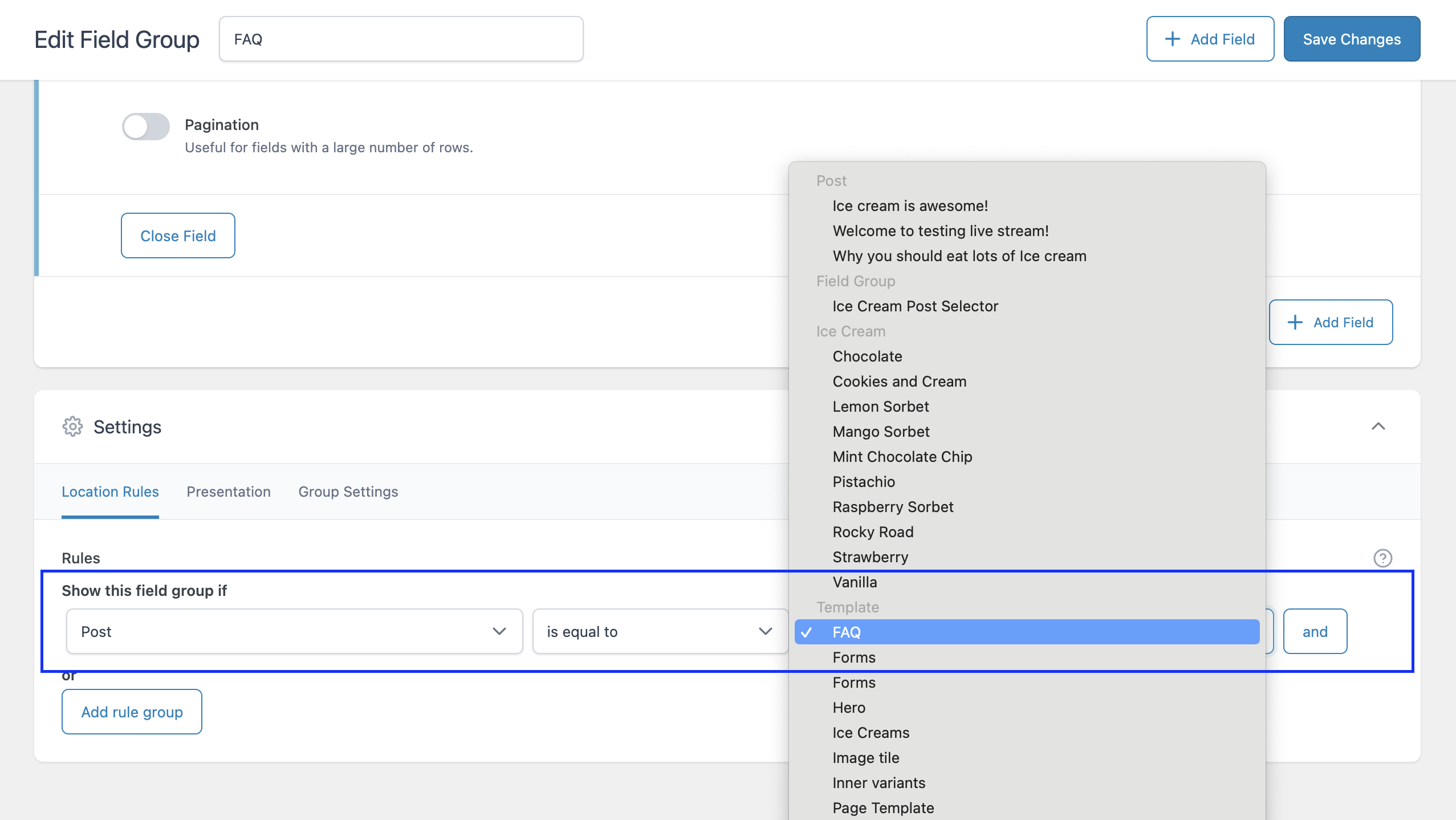 <figure><img src="https://115503993-files.gitbook.io/~/files/v0/b/gitbook-x-prod.appspot.com/o/spaces%2FVRpgq7lelxP9PFleE0QT%2Fuploads%2FDrtCoJ8EQIzoRMvmtWpY%2FScreenshot%202024-08-02%20at%208.26.14%E2%80%AFPM.png?alt=media&#x26;token=2170e212-c00f-4b6e-95f6-1dd1f74d683c" alt=""><figcaption><p>Here, we are assigning the field group to FAQ Bricks Template</p></figcaption></figure>
