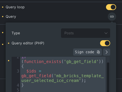 $ids = gb_get_field('mb_bricks_template_user_selected_ice_cream');