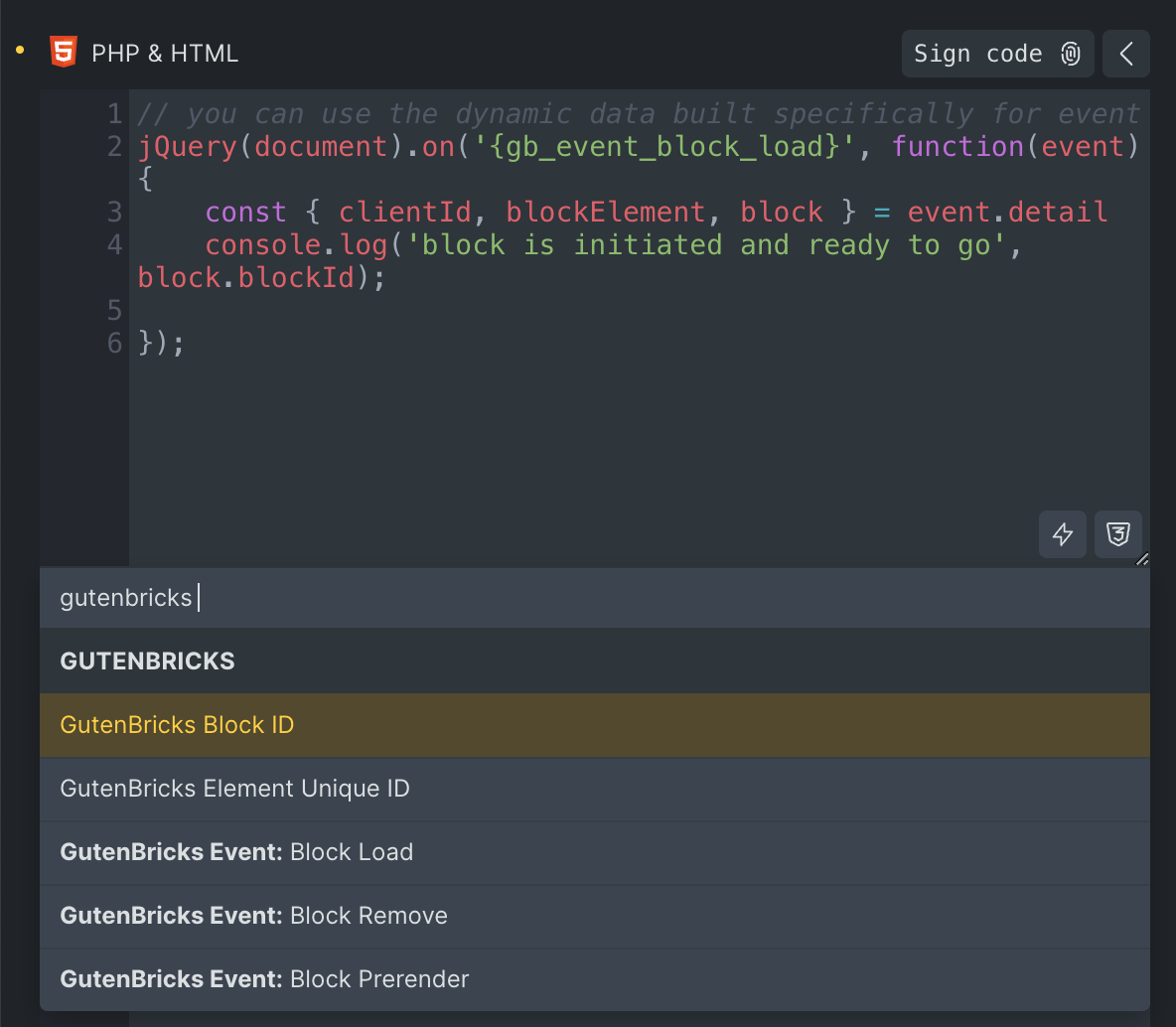GutenBricks provides dynamic data built for events. These events are triggered when a specific block loads, removes and prerenders (meaning renders static block without editing features.) You can use these dynamic events to run JavaScript functions for any blocks inside the Gutenberg editor.